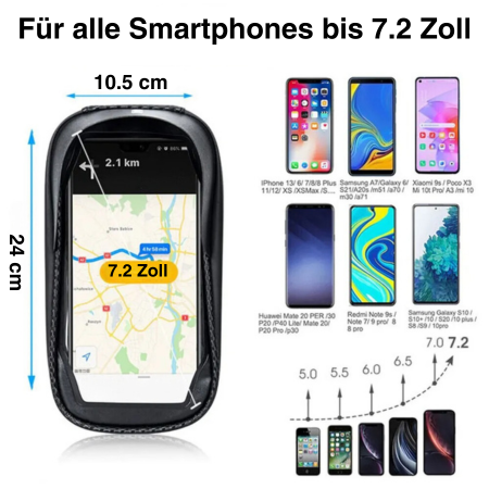Mit unserer Radsporttasche EasyBag gehört dieses Problem der Vergangenheit an. Diese innovative Fahrradtasche kann für jedes Smartphone bis 7,2 Zoll Größe genutzt werden. Dabei ist die Hülle aus wasserfestem hochwertig verarbeitetem Nylon mit gummierten Reißverschlüssen und bietet Dir die Möglichkeit, Dein Telefon zu bedienen, ohne es in die Hand nehmen zu müssen.